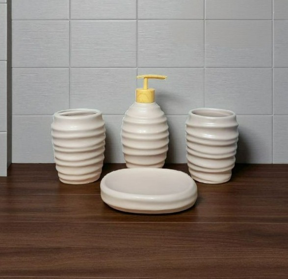 Add refined elegance to your bathroom with this Soft Ivory Ceramic Accessory Set. Featuring a modern wavy pattern and luxurious golden pump, this 4-piece collection brings both function and high-end style to your daily routine.
