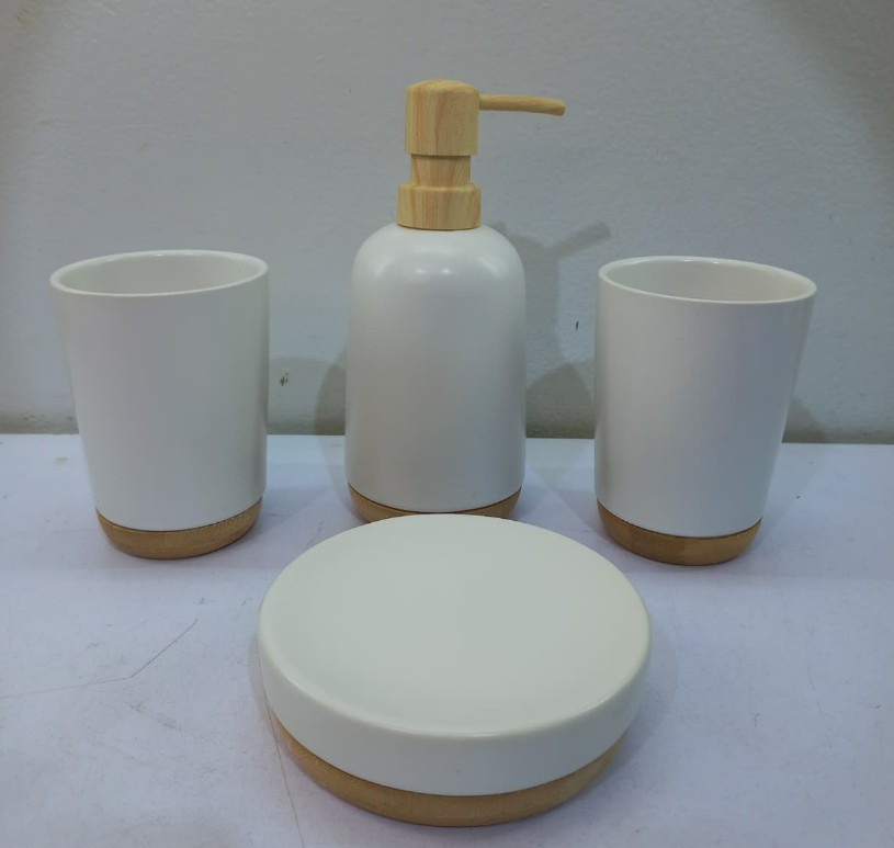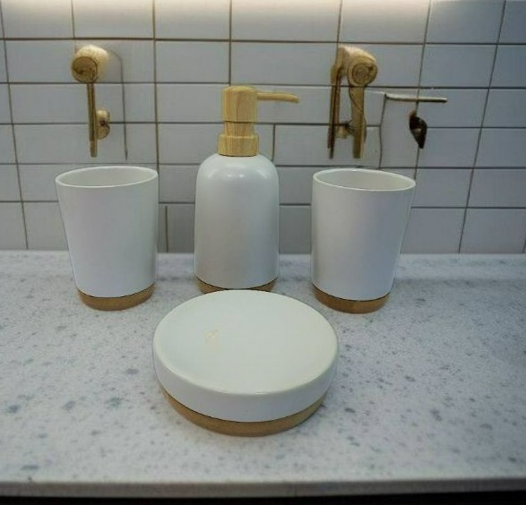 Minimalist White & Wood Bathroom Accessory Set – 4 Pieces